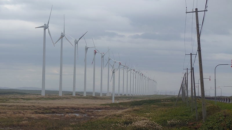 ![]() ぐんぐん北上して、「オトンルイ風力発電所」。 ずらりと並んだ風車が圧巻です。 このあたりから雲行きが怪しくなりました。降ってきそう…。 |