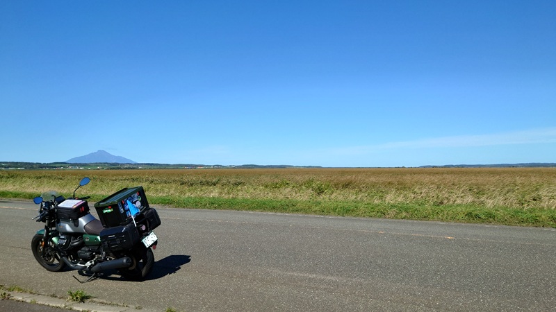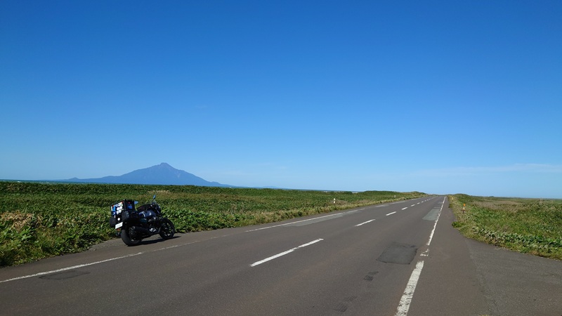 ![]() 道道106。 ガードレールも電柱もない原野を貫く直線路を、利尻山を横目に北上。 |