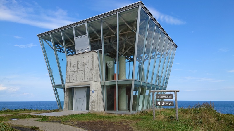 ![]() 日の出岬の展望台からオホーツク海を眺めます。 この展望台はガラス張りで風をよけてくれてありがたい。 |